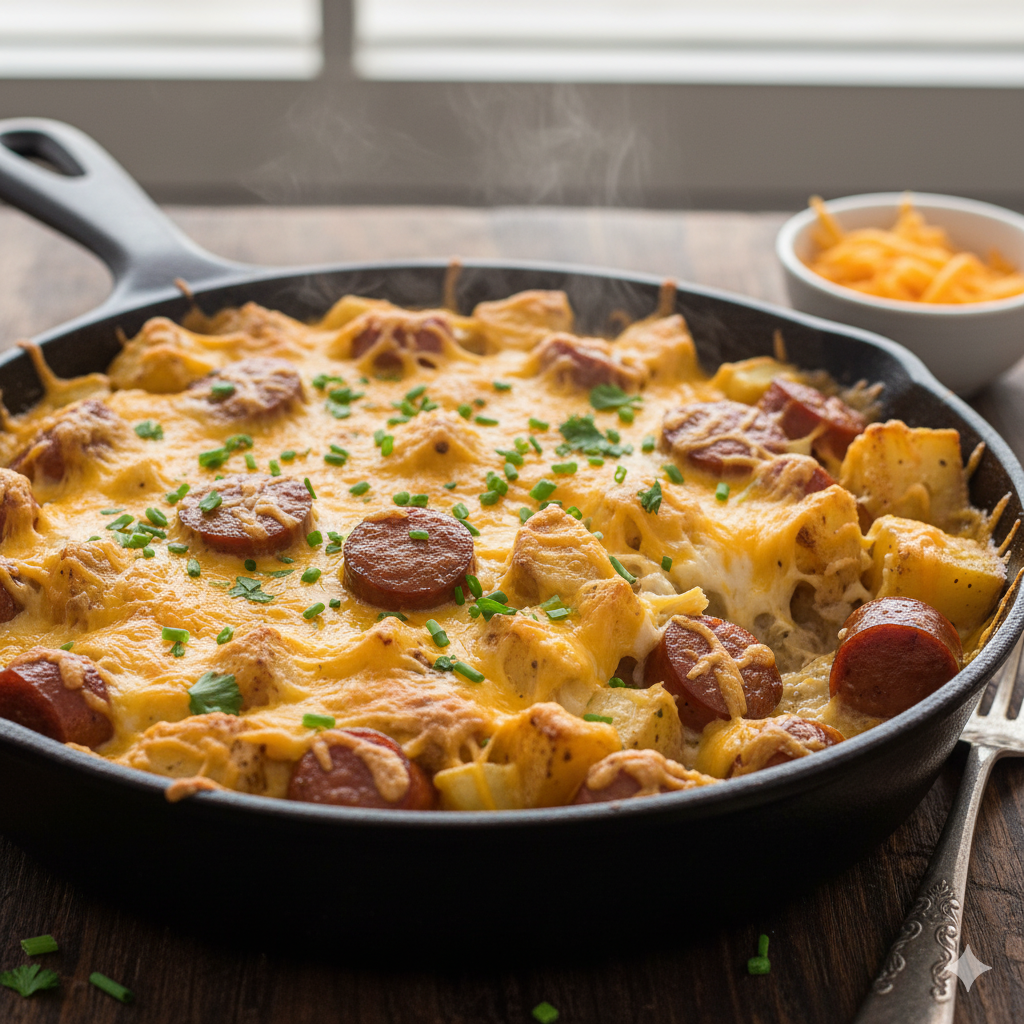 A one-pan dish featuring crispy potatoes, savory smoked sausage, and melty cheese, perfect for family dinners or gatherings.