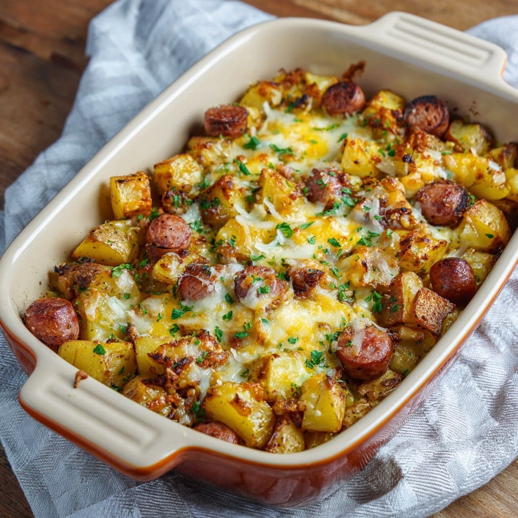 A simple yet delicious one-pan meal combining tender potatoes and savory smoked sausage with zesty ranch seasoning and melted cheese.