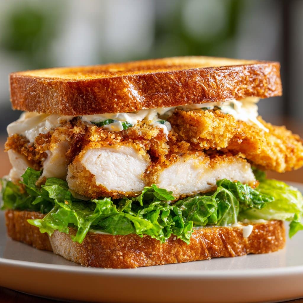 A crunchy, juicy sandwich featuring crispy breaded chicken, creamy Caesar dressing, and fresh romaine on a baguette.