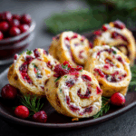 Delicious roll ups featuring a creamy filling and tart cranberry sauce, perfect for holiday gatherings.