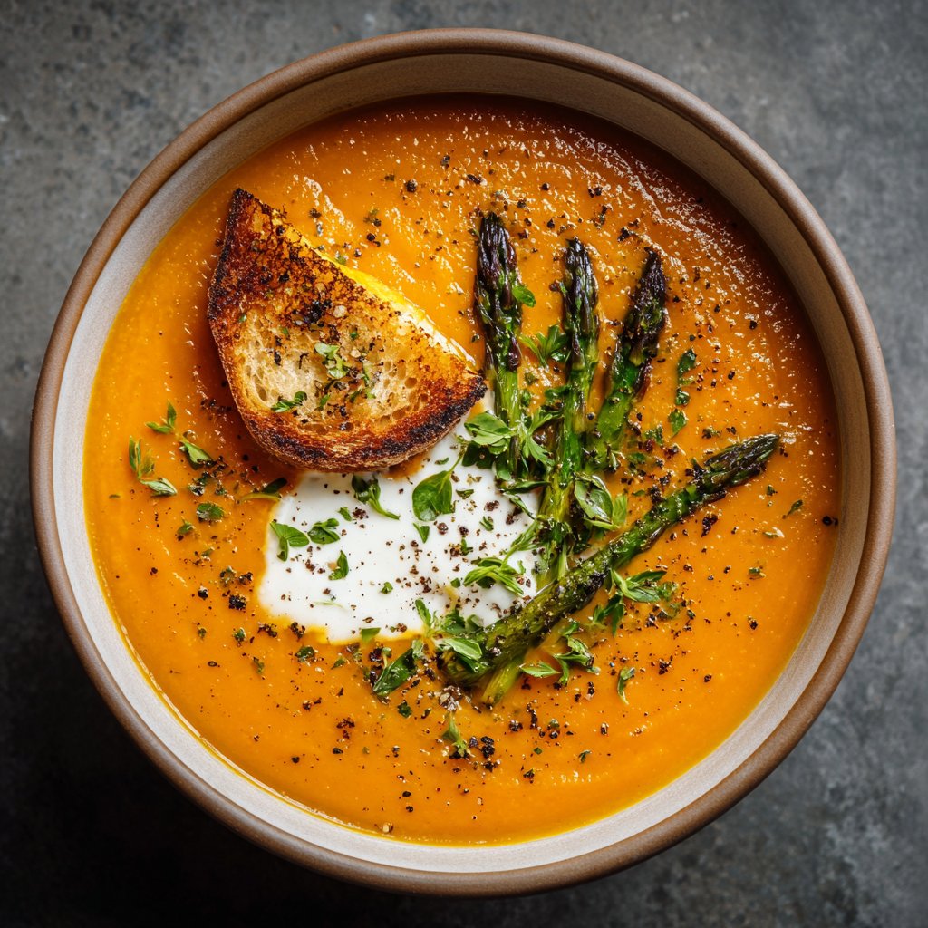 A smooth and creamy soup made from roasted vegetables, perfect for any season.