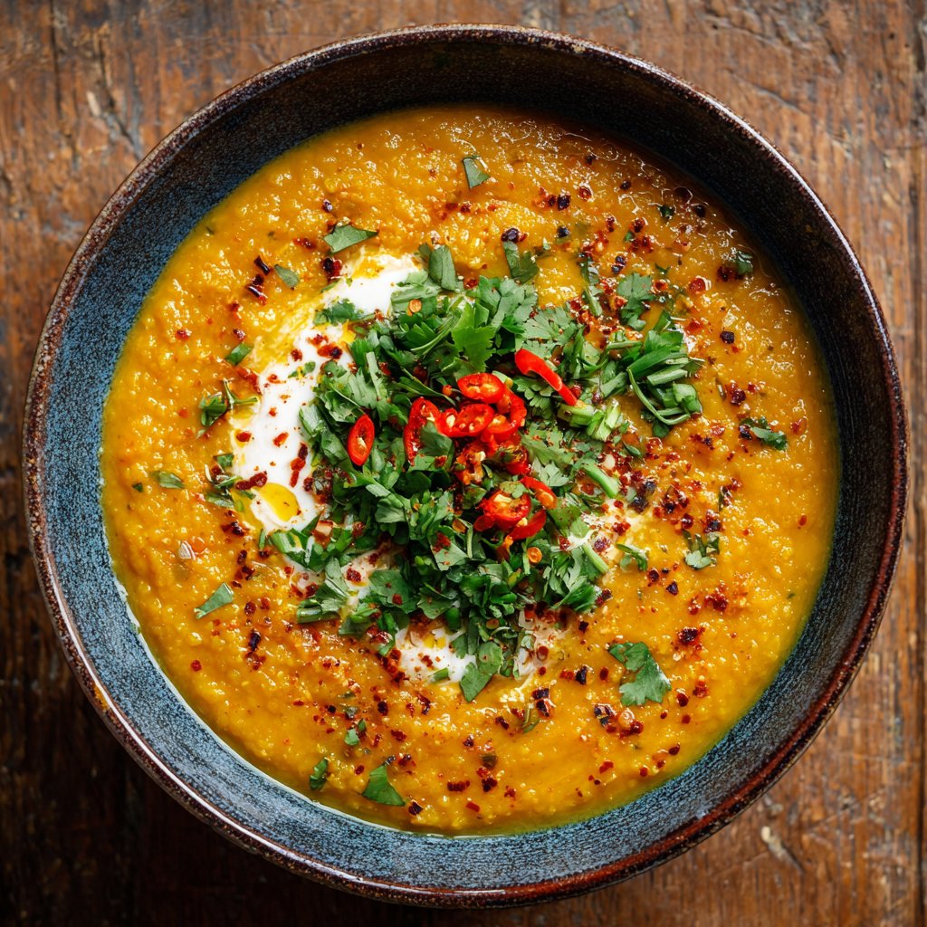 A warm and hearty vegan soup combining the sweetness of carrots with earthy red lentils and fragrant spices.